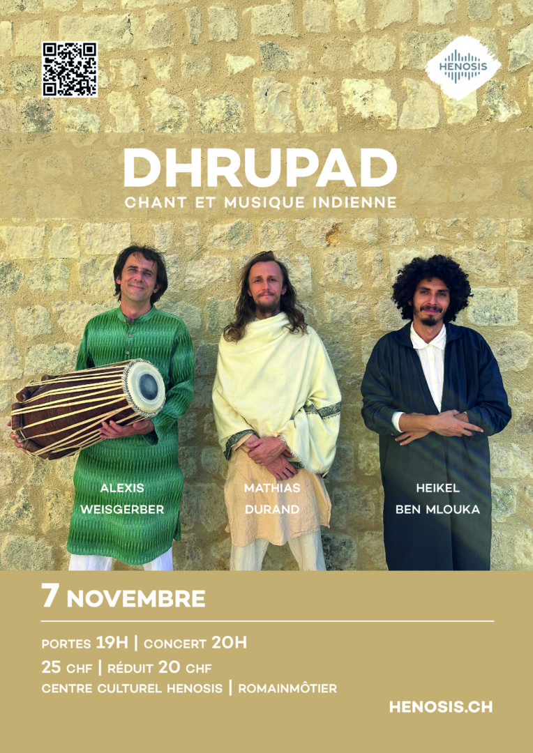 Ce concert public est dans la continuité du stage de Dhrupad chez Henosis. Le trio réunit Heikel Ben Mlouka et Mathias Durand au chant, accompagnés par Alexis Weisgerber au pakhawaj. Issus de la tradition du Dhrupad, la forme la plus ancienne de la musique classique de l’Inde du Nord, les musiciens ont étudié cette discipline exigeante auprès des maîtres de la tradition, notamment les frères Gundecha à Bhopal et Pandit Rajshekhar Vyas à Udaipur, selon la transmission orale du gurushishya parampara. Leur pratique s’enracine dans l’apprentissage patient de la voix, de l’écoute et de la microtonalité. À travers l’exploration d’un raga, ils déploient un art de l’improvisation profondément méditatif où les voix se fondent dans la résonance continue du tanpura. Le pakhawaj, percussion ancestrale aux basses profondes et aux harmoniques riches, vient ponctuer et soutenir le développement musical. L’auditeur est ainsi invité dans un espace sonore contemplatif où le temps semble se dilater, propice à une écoute intérieure.